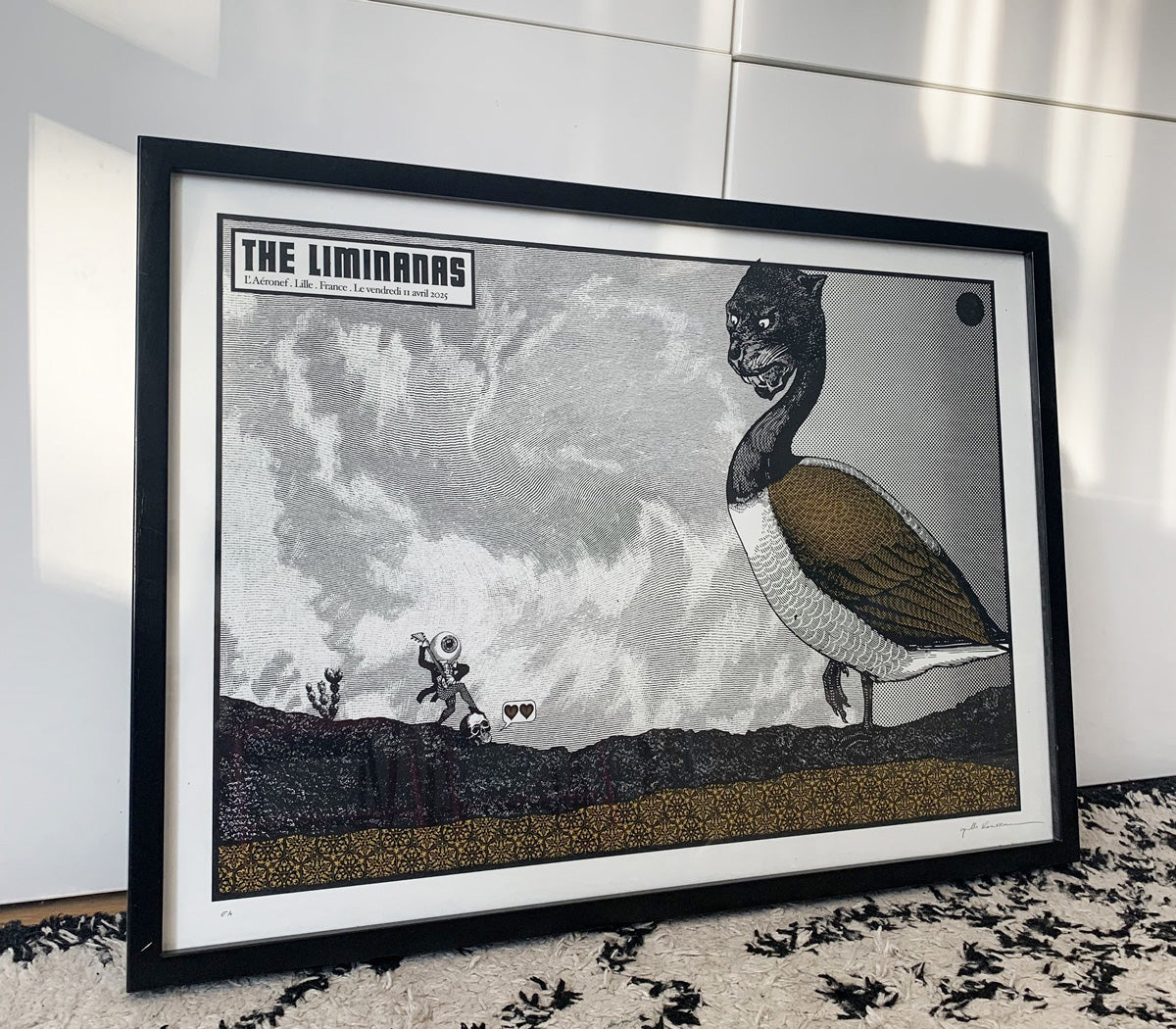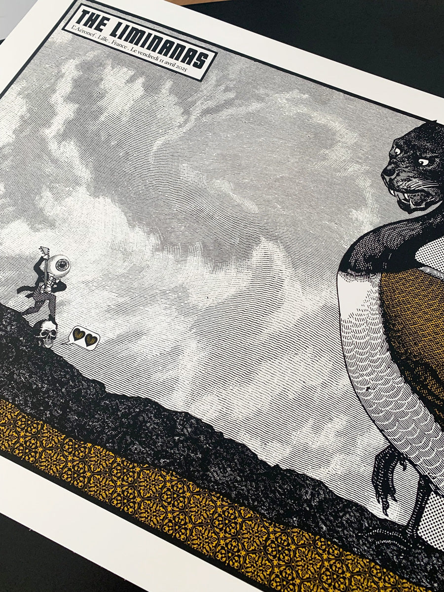 Silkscreened gigposter for The Liminanas at l'Aéronef Lille - 2025, April the 11th.Artist: Cyrille Rousseau2 colors. Edition of 50Size : 50x70cm#liminanas #gigposters #affiche #psycherock #psychedelique #poster #rockart Voir la description complète du produit