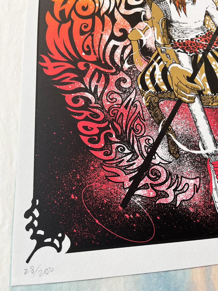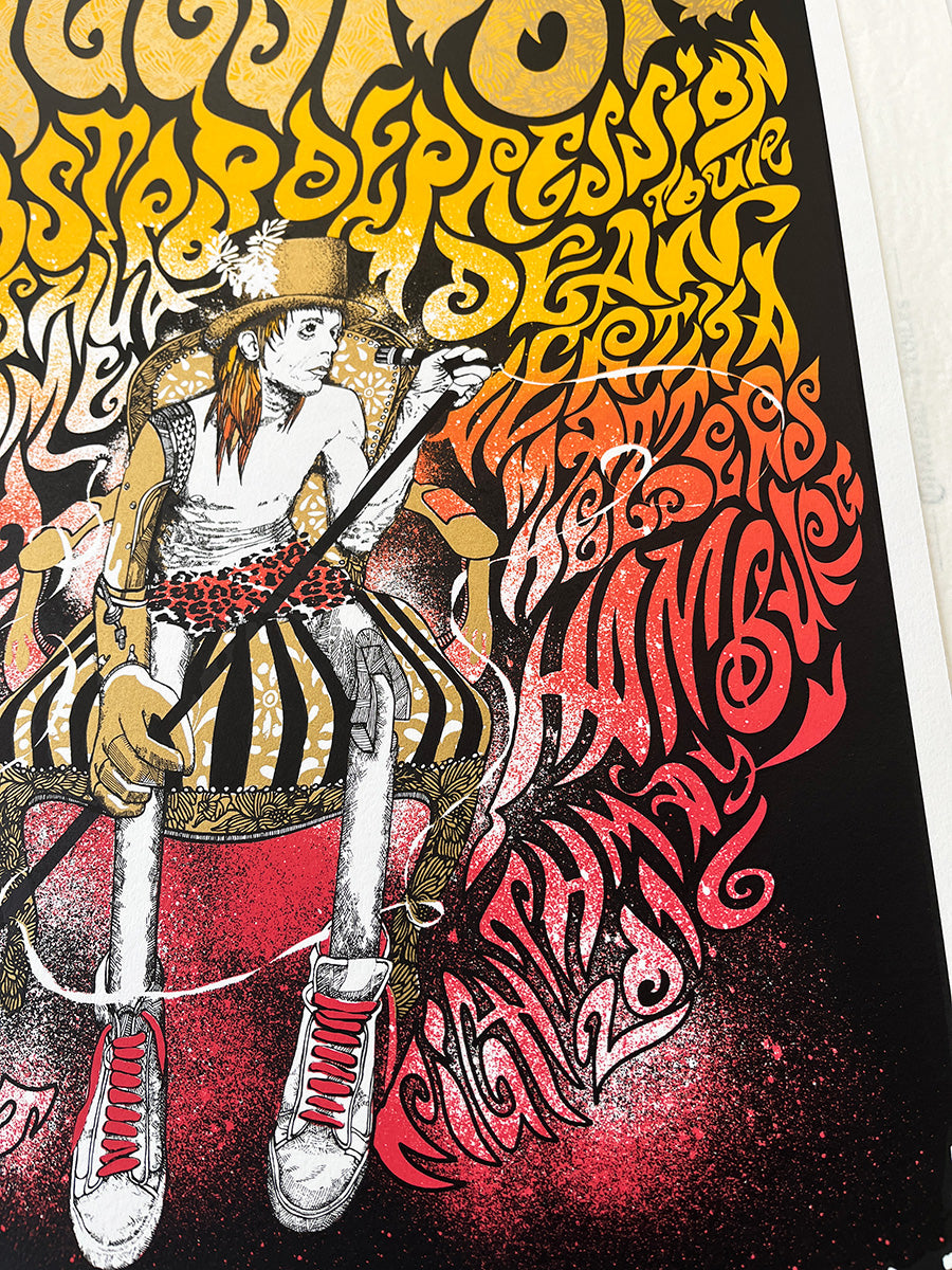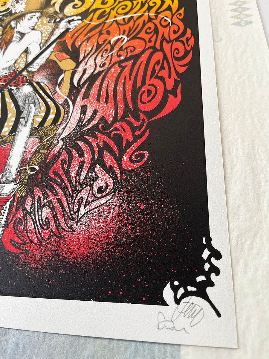 Signed by Jemma Treweek, with lettering by Dan Johnson, this poster presents a powerful and deeply evocative vision of the rock icon: a free, blazing, almost timeless figure.
